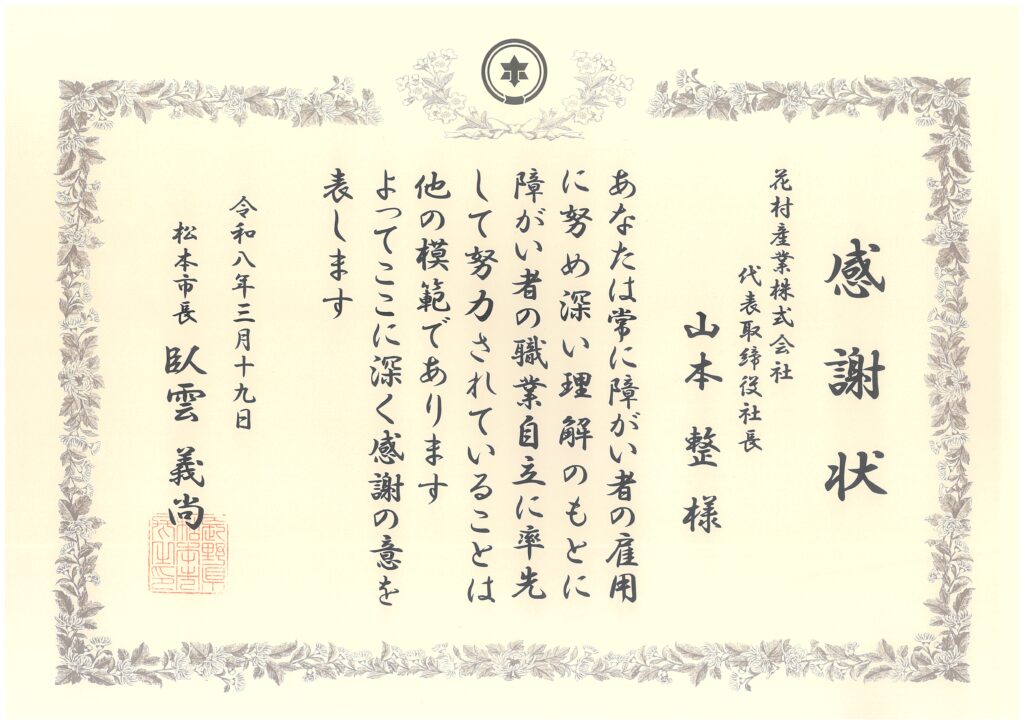 当社の本社がある、長野県松本市より、障がい者雇用に対する報奨式が行われ、当社が表彰をうけました。